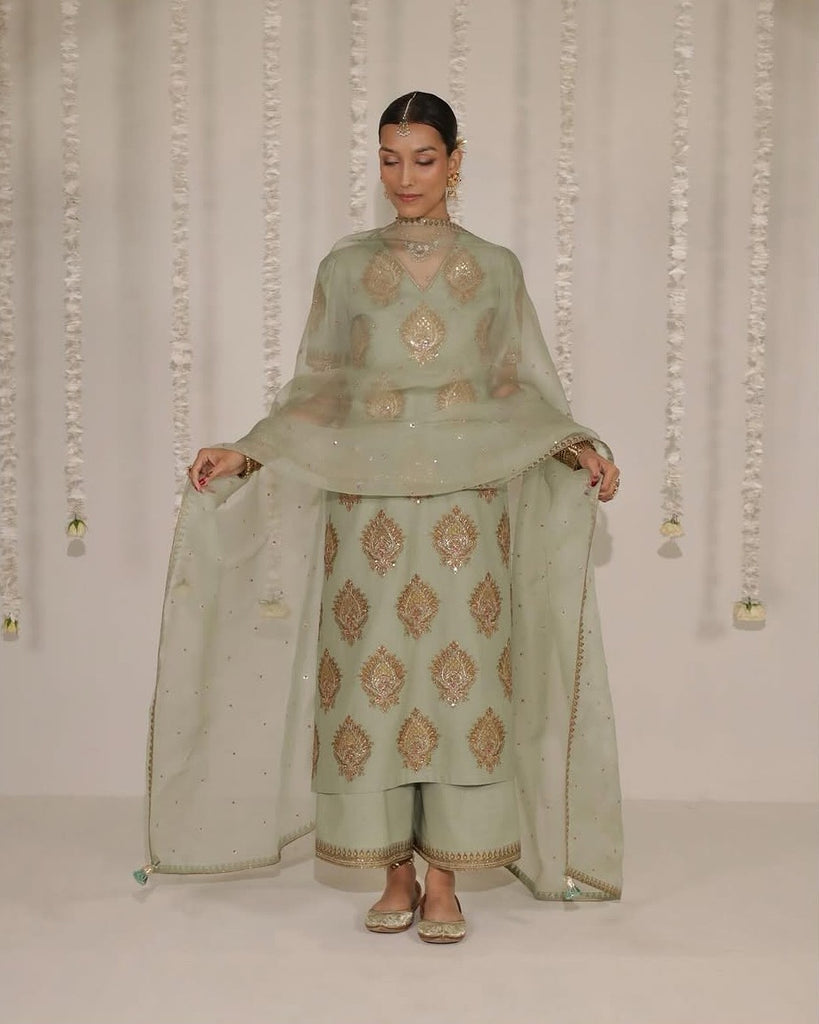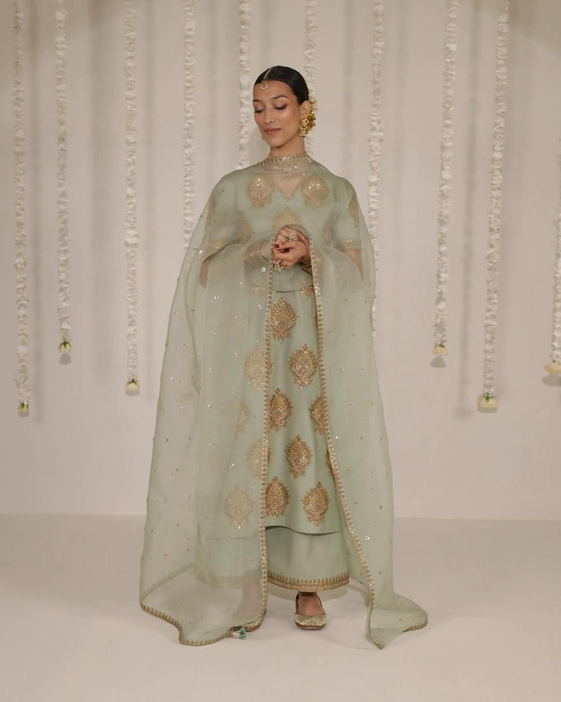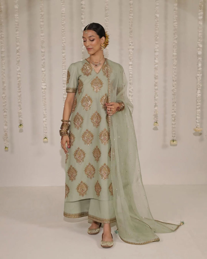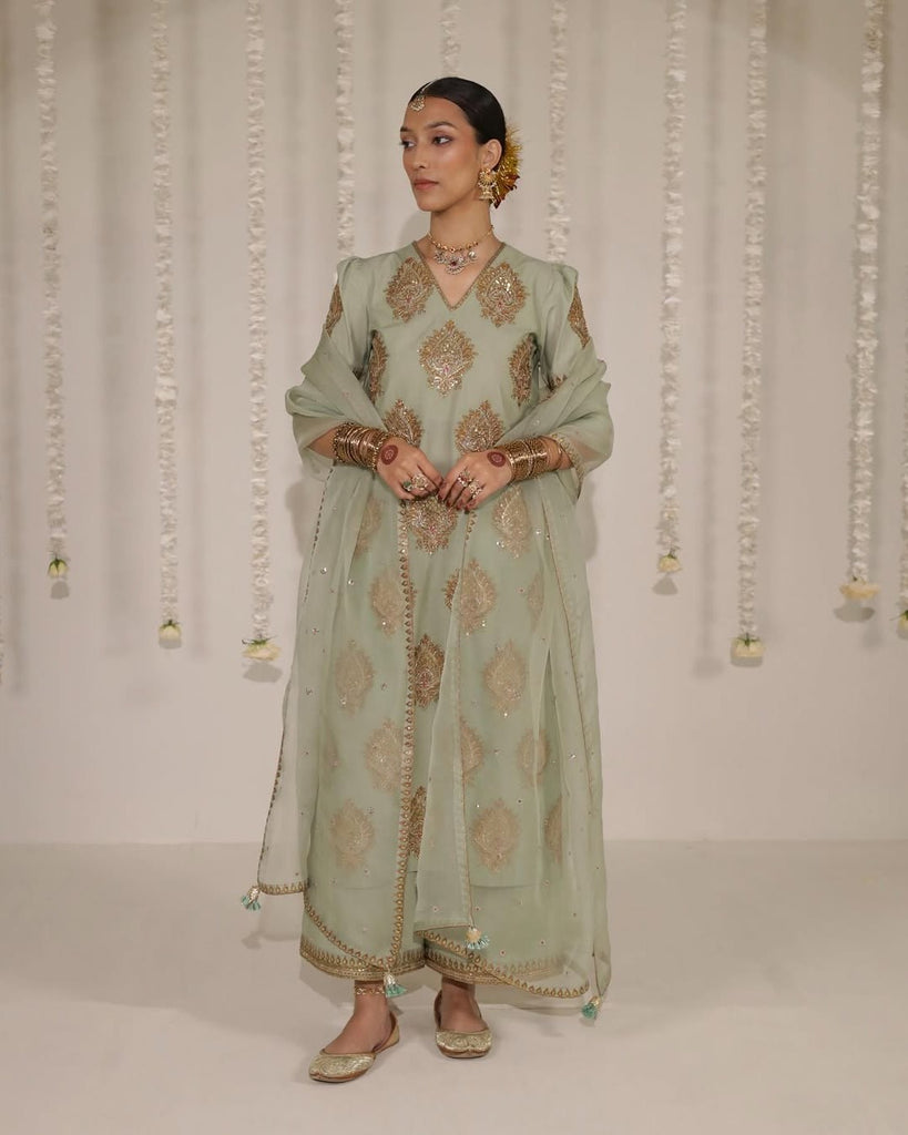 Pistal is a premium 3-piece Lawn suit in pastel green, perfect for formal occasions. The long shirt features golden embroidery pan patti throughout and is available in short sleeves style. Tailored trousers with embroidered borders and an ornate Dopatta with gold embroidery, and all over booti, and sequins complete this elegant ensemble.