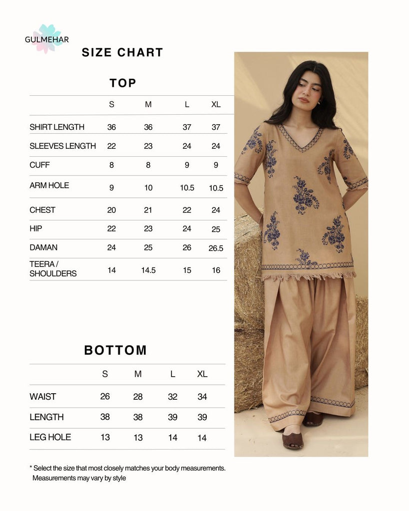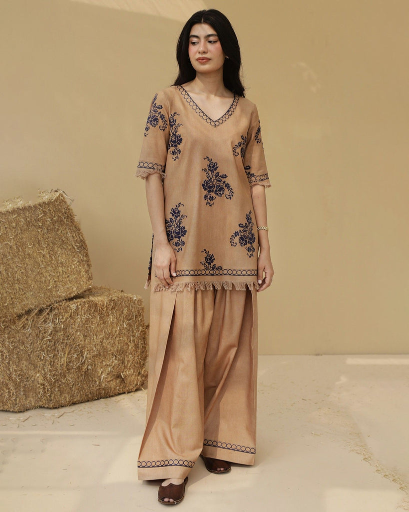 Almond is a refined 2-piece ensemble in a Almond Brown color, featuring intricate embroidery . Made from luxurious Premium Plain Khaddar Fabric, it includes a tailored Short kameez with Floral embroidery detailing paired with coordinated Embroidered Farshi Shalwar Bottom.