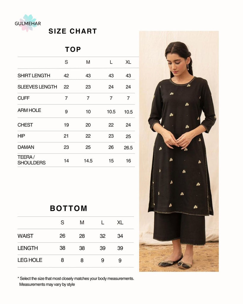 Black Bloom, a stunning piece crafted from rich Premium Slub Khaddar fabric, showcasing exquisite floral yelow and green bunch embroidery work all over on shirt paired with box trousers with detailings on hem. The Bold color ntricate detailing create a striking silhouette, perfect for adding a touch of elegance to your wardrobe. Ideal for both casual and formal occasions, Black Bloom effortlessly combines comfort and style, making it a must-have for any fashion-forward individual.