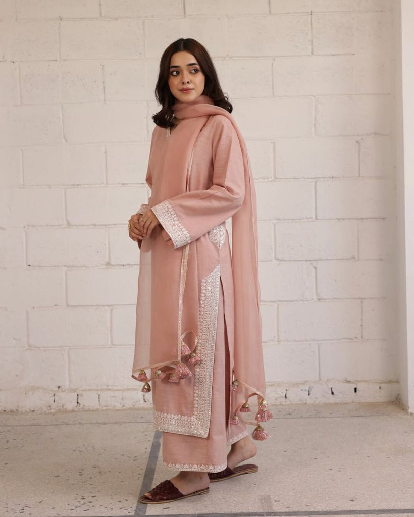 Dusty Pink | 3-PC embroidered stitched outfit crafted from slub khaddar. Enhance your collection with the enduring sophistication of the Snowdust embroidered outfit. Its soft khaddar fabric delivers both comfort and elegance, making it suitable for a variety of occasions. The outfit’s luxurious texture and traditional embroidery provide a refined look. Designed for everyday comfort and style, this set offers adaptable wear options. The classic yet elegant silhouette shapes a sleek, contemporary look, complemented by a medium-length shirt that balances practicality with modern design.