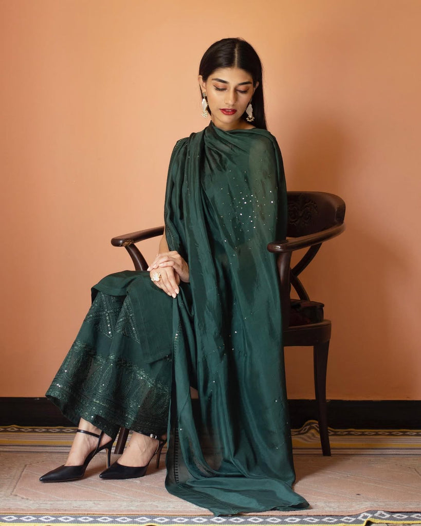 JADORE is a refined 3-piece ensemble in a bottle green color, featuring intricate embroidery and subtle sequins. Made from luxurious Premium slub khaddar, it includes a tailored kameez with embroidered buttons detailing paired with coordinated straight-cut heavy embroidered trousers and a lightweight embroidered chiffon dupatta accented with sequins touches.
