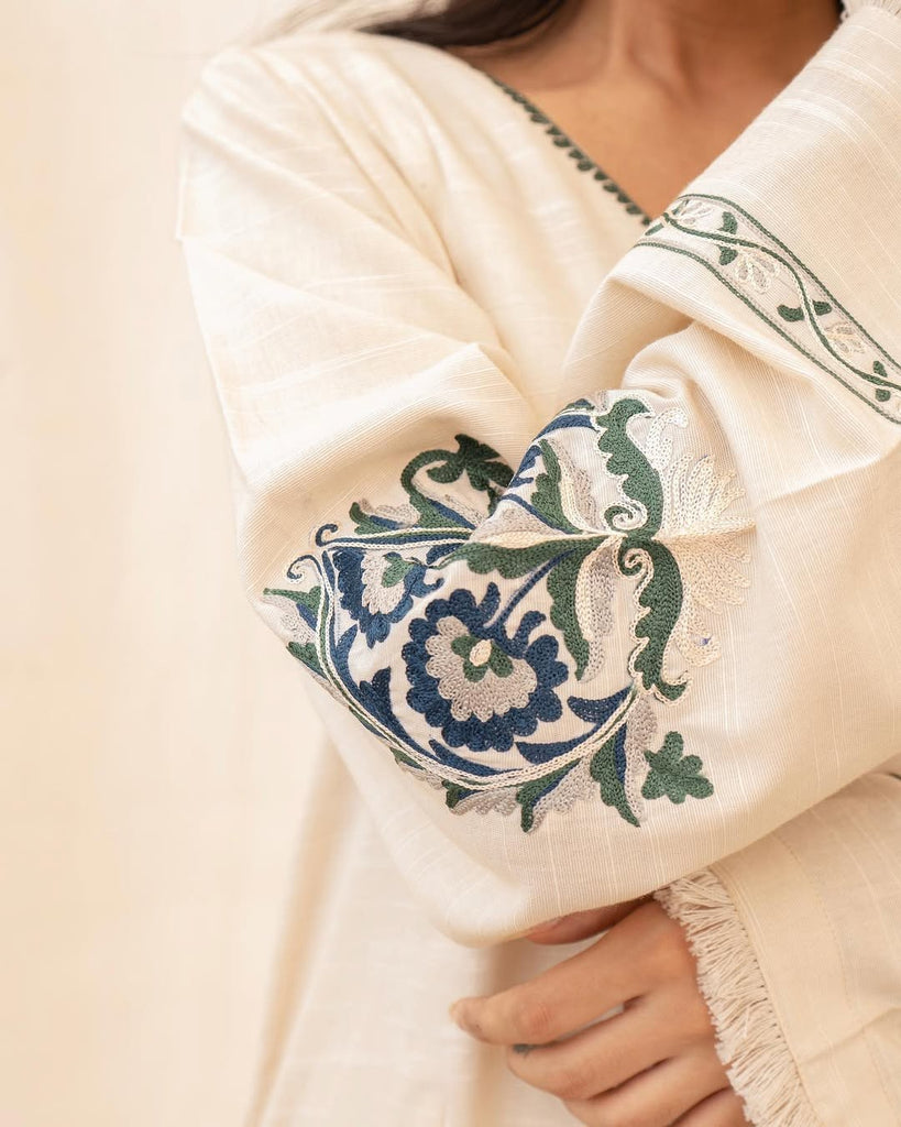 Elevate your wardrobe with Nooray's distinguished 3-piece collection, engineered for women who appreciate refined craftsmanship. This premium ensemble features Premium Slub Khaddar in elegant Off White, combining traditional artistry with modern sophistication. The signature long shirt showcases exquisite Chain Stitch embroidery adorning the sleeves and neckline, while precisely tailored trousers echo this decorative excellence throughout. The accompanying shawl presents an impressive focal point with its ornamental borders and intricate motif work, designed to drape with effortless grace. Perfect for formal occasions, upscale gatherings, and special celebrations where quality and attention to detail matter most.