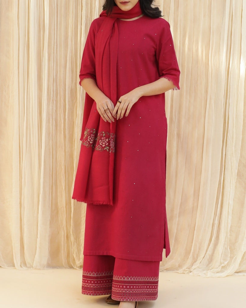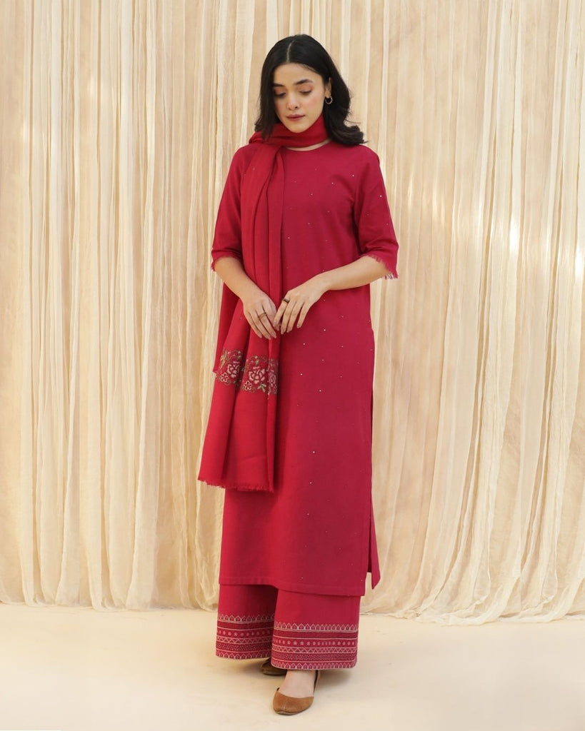 Discover the refined beauty of Rosetta, a sophisticated ensemble crafted entirely from soft, cozy and Premium Plain Khaddar Fabric. The kameez and dupatta and trousers feature delicate Cross Stitch embroidery, creating a harmonious look that exudes elegance and warmth.